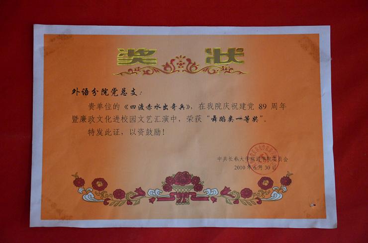 建党89周年暨廉政文化进校园文艺汇演“舞蹈类一等奖”-2010年