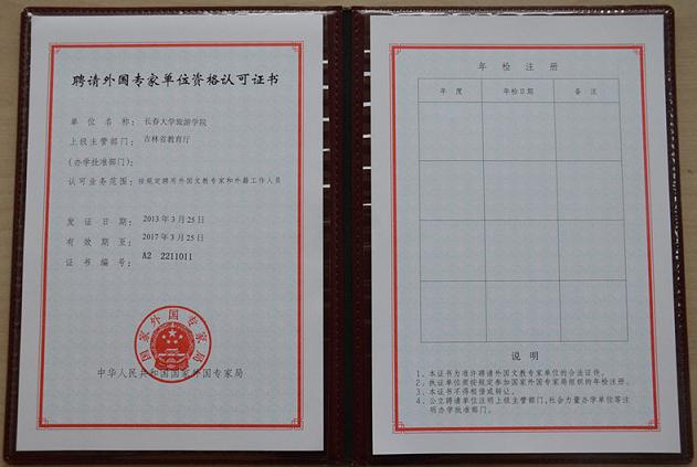 随着学校国际交流活动日益增多,教学管理工作日益步入正轨,办学规模日益扩大,外语教学任务逐年增加,对于外国专家的需求日渐增多,对外自主招聘外教的要求十分迫切,因此,金沙官网外语分院、国际交流学院积极主动、细致认真地做好各种材料和文件的申报和联络工作。于2013年元月正式向吉林省外国专家局递交了申请,希望获得聘请外国专家单位资格。 经长春市公安局、吉林省教育厅、吉林省公安厅、吉林省外国专家局检查审核,国家外国专家局批准,金沙官网于2013年3月25日荣获了国家外国专家局《聘请外国专家单位资格认可证书》。 荣获该证书,是金沙官网国际交流工作的重大突破,标志着学校国际交流与合作工作迈上了新的台阶,为学校的未来发展建设奠定了较好的基础,为学校未来的转设工作提供了有力的条件;标志着学校开通了对外聘请外国文教专家和外籍工作人员的渠道,学校可以广泛的和国际上有关高校开展国际交流项目和活动。 聘请外国专家单位资格许可证书的获得,对于金沙官网聘请外国文教专家、开展对外交流项目、提高教学与科研水平、扩大学校在国内外的知名度都有着十分重要的意义,是金沙官网国际交流工作一个重要的里程碑。