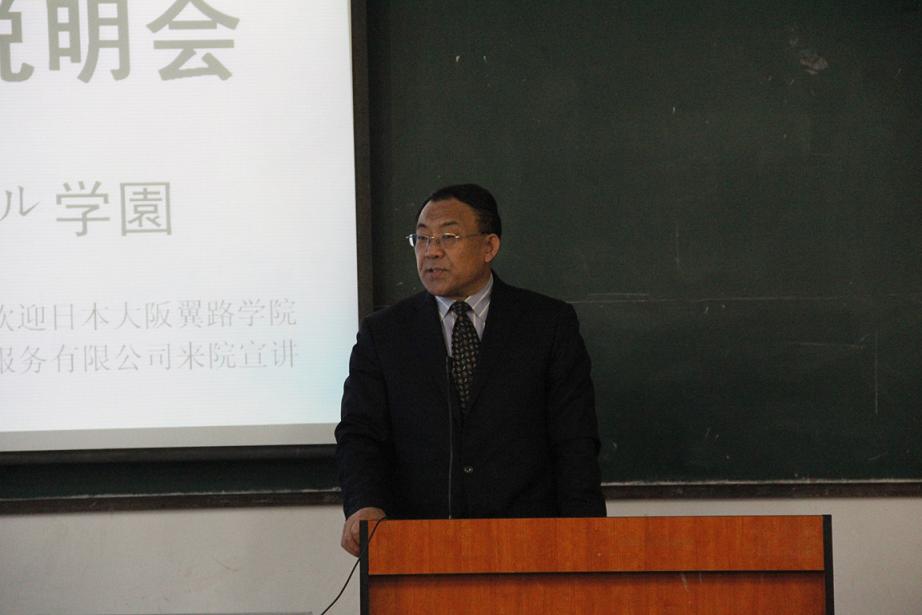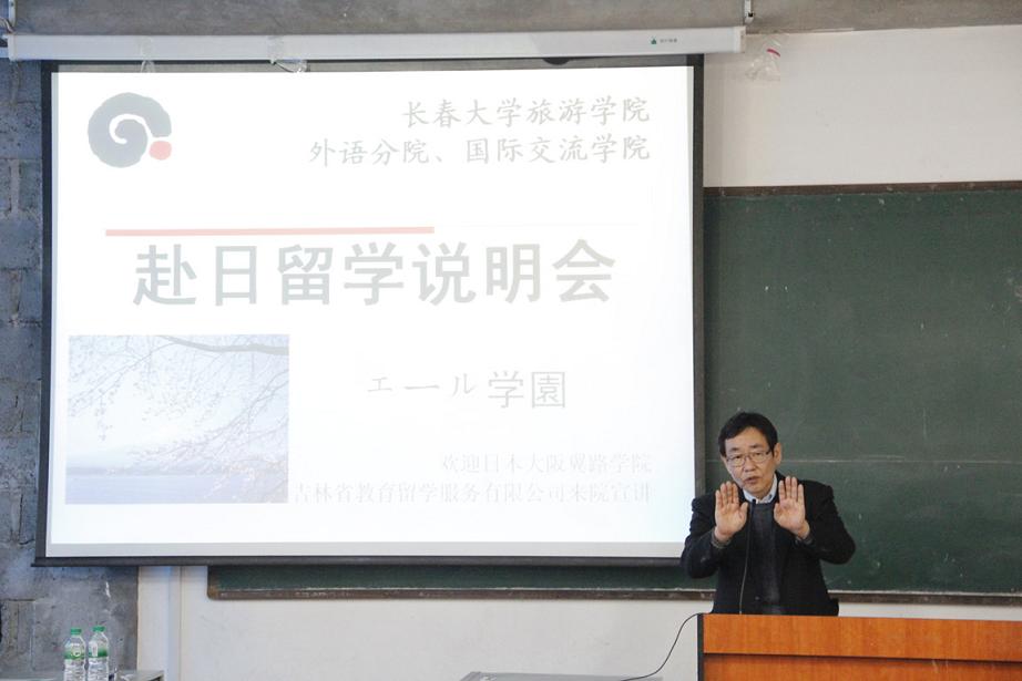 为使广大同学更加了解赴日本留学的相关信息,解答大家对赴日留学相关情况的疑问,我院于2013年4月17日下午在教学楼247教室举办了一场赴日留学说明会,外国语学院、国际交流学院院长黄江,院办主任满歆琦,学办主任许乔木,学院团委书记孙野,吉林省教育留学服务中心有限公司代表,日本大阪翼路学园代表,以及外语分院师生共150人参加。