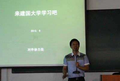 6月19日下午,我院特别邀请友好院校韩国建国大学GLOCAL校区代表在教学楼247室举办了赴韩留学说明会。韩国建国大学GLOCAL校区对外协力部部长崔佶容,对外协力处主任李东万,建国大学GLOCAL校区国际委员李金声,招生就业处处长冷震洲,国际交流学院干事张俊梅,外国语学院朝鲜语老师李泽铭及各学院学生代表参加。