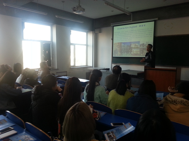 2016年10月11日下午,我院在教学楼222教室举办赴新西兰UUNZ学院留学宣讲会,来自新西兰UUNZ学院校方代表王旭老师专程来到我院开展项目宣讲,外国语学院及经济管理学院百余名学生到会参加。外国语学院、国际交流学院黄江院长、于刚副院长、招生就业处冷震洲处长等列席参加。