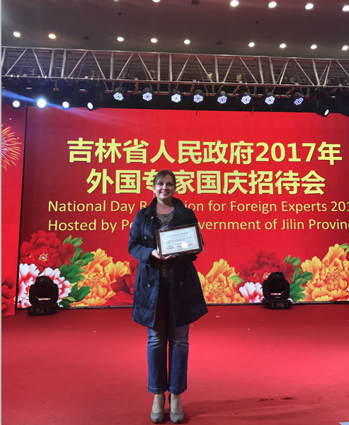 2017年9月28日晚,由吉林省人民政府主办,省人力资源和社会保障厅、省外国专家局承办的“2017年吉林省外国专家国庆招待会”在松苑宾馆举行。我院俄籍教师YANA BELOKOPYTOVA应邀参加招待会,获得了吉林省本年度“优秀外国专家”荣誉称号并接受表彰,我院办公室负责人刘名陪同参与。