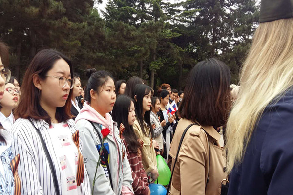 在人民广场纪念碑前,我院学生手执鲜花,同各校师生一起聆听领导致辞和英雄故事,歌唱«На безымянной высоте»,共同缅怀英烈和死难者,为烈士献花寄托哀思。之后观看了吉林大学学生代表歌唱的«喀秋莎»、长春大学学生代表朗诵的诗歌及俄罗斯留学生们带来的精彩舞蹈。