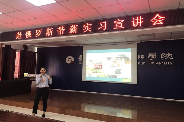 5月21日下午,为拓宽金沙官网海外实习范围,增加学生实习就业渠道,我院在行政楼三楼报告厅召开了赴俄罗斯带薪实习宣讲会。校党委副书记、纪委书记程越、国际交流学院(处)副院长(副处长)王丹出席了本次宣讲会,我院100余名学生报名参会。