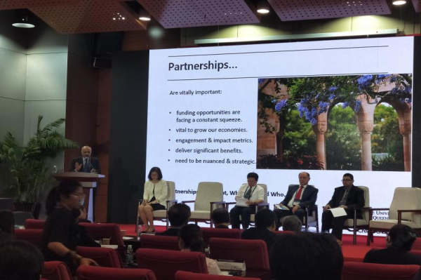 论坛期间,我院领导与其他高校参会代表在分议题环节“跨学科研究和国际合作”展开探讨,并就昆士兰大学副校长莫函 克里什那莫非、东北大学副校长唐立新、开姆尼茨工业大学“精英集群”首席执行官洛萨 克罗尔、加札马达大学科研处副处长米尔万 乌莎达、泰晤士高等教育亚洲区域董事兼总经理郑柏霖的发言进行了深入交流。