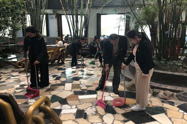 教师党员们迅速投入到了清扫活动中。大家拿着扫把、垃圾袋等工具,分区清扫,既有合作又有分工。