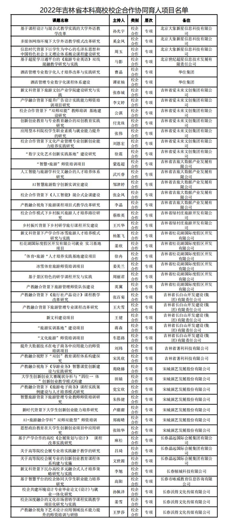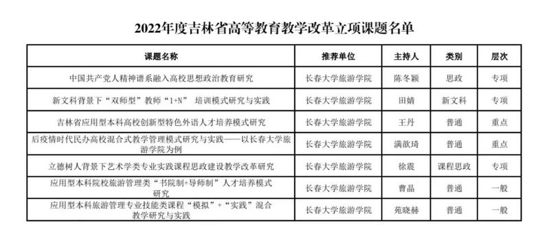 近日,吉林省教育厅公布了《关于公布2022年度吉林省高等教育教学改革立项课题名单的通知》《关于公布2022年度吉林省本科高校校企合作协同育人项目名单的通知》,吉林省教育厅在各校推荐申报的基础上,经过材料初审和专家通讯评审,最终确立了立项名单。2022年共确立教改课题400项(重点课题120项、一般课题180项、思政专项20项、课程思政专项40项、“四新”专项40 项),2023年共确立教改课题300项(重点课题120项、一般课题180项)。