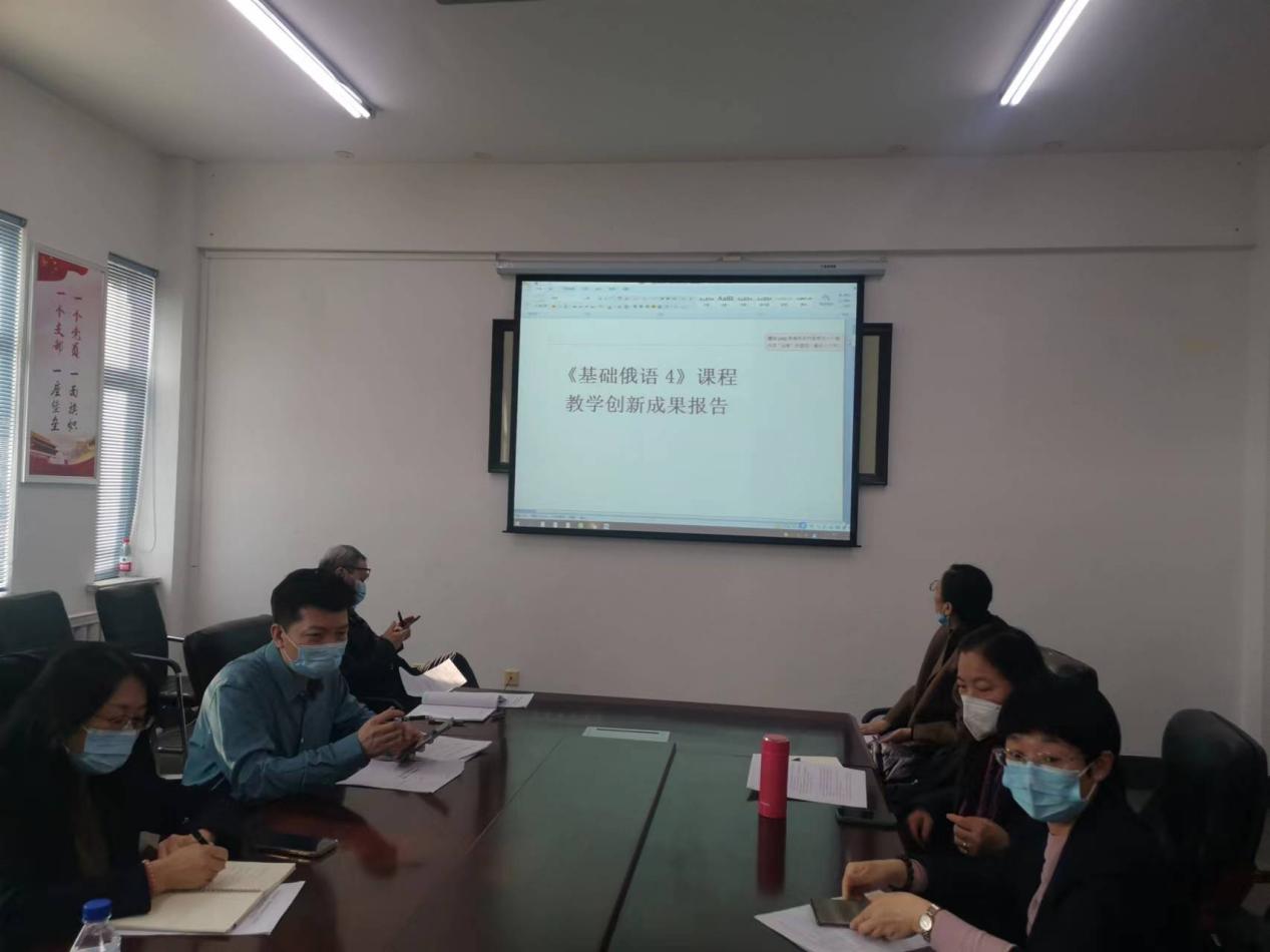 接着,赵静老师与大家分享了参赛课程《基础俄语》4的教学创新成果报告,分享过后在场人员结合参赛文件要求从专家的角度、评分角度对报告中的摘要、素质目标、创新特色、课程思政、评价设计等内容提出了相应的修改建议,俄语带头人田君教授还建议要紧紧围绕“推动教学创新 培养一流人才”这一主题,突出“创新”、充分展示“思政建设”,将“讲好中国故事、传播好中国声音”融入创新特色中,突出能力目标,升华家国情怀。赵静老师根据大家的修改建议进行了记录和调整,并优化了文字表述。