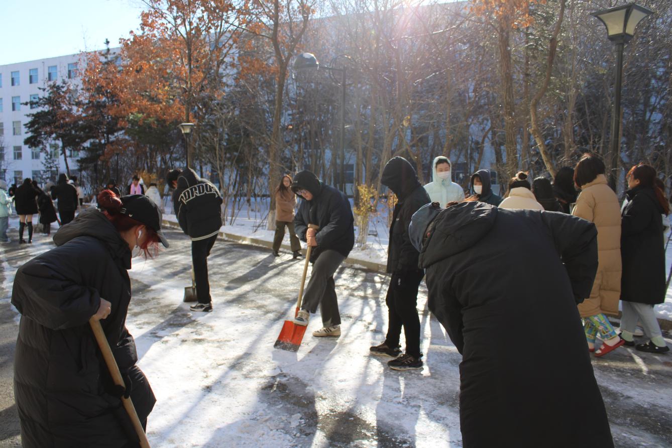 ▲扫雪护行,情暖人心——外国语学院、国际交流学院开展“破冰行动”