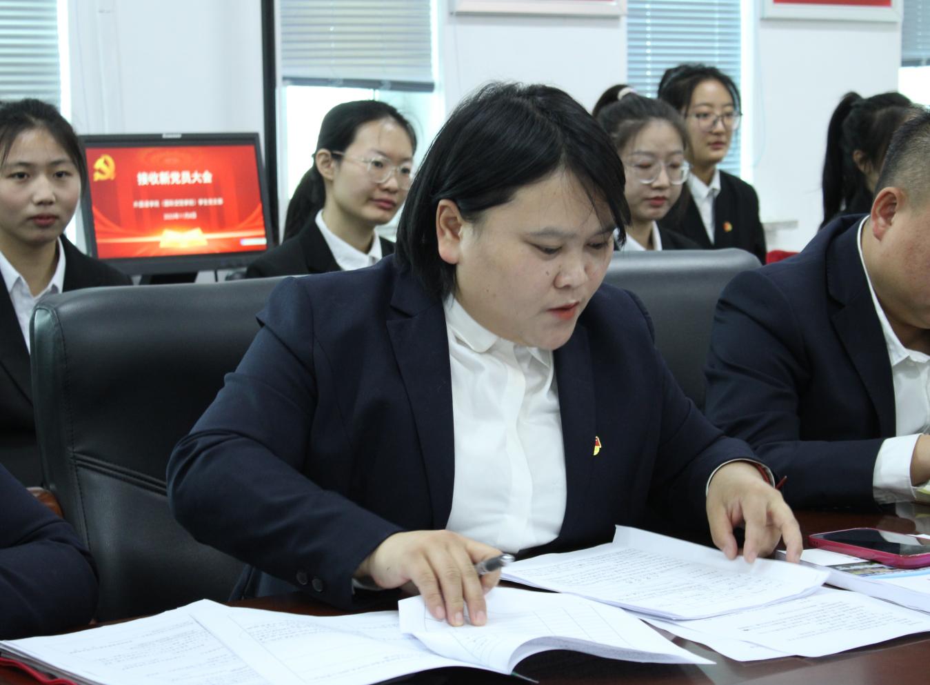 会议伊始,讨论了接收王一涵9为中共预备党员的问题。按照党员发展会议程序,依次完成了宣读《入党志愿书》并汇报个人情况,入党介绍人说明考察意见,宣读审查情况,与会党员充分讨论并发表意见,与会正式党员投票表决,宣布支部接收决议等流程,9名同全票通过。随后,她们纷纷作表态发言,表示在今后的学习工作中,会以更加严格的标准要求自己,不断强化自身修养,加强理论学习,坚守初心使命,把党员先进性体现在学习、工作和生活上,争取早日转为正式党员。