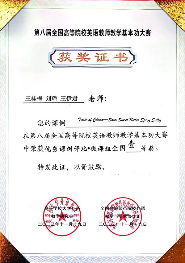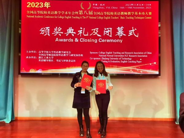 在近日于杭州落幕的2023年全国高等院校英语教学学术年会暨第八届全国高等院校英语教师教学基本功大赛中,金沙官网教师喜获佳绩。外国语学院王桂梅团队(刘璠、王伊君)荣获微课组全国一等奖;贾春巍荣获说课组全国一等奖;李然荣获实录课组吉林省一等奖;基础部李宣颖团队(路平、王璨)荣获微课组全国三等奖;孙光宇荣获实录课组吉林省二等奖;李维伟荣获说课组吉林省三等奖。