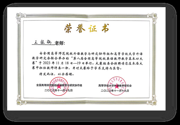 英语专业教研室主任王桂梅在会议期间还受邀担任基本功大赛英语专业组·实录课的教师评委,其工作得到大赛组委会的认可,并给予颁发教师评委荣誉证书。