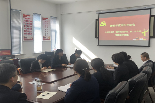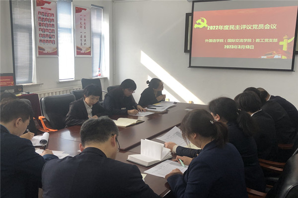 2023年3月13日下午,外国语学院(国际交流学院)教工党支部在201党团活动室召开2022年度专题组织生活会和民主评议党员会议,会议由支部书记张昀主持。