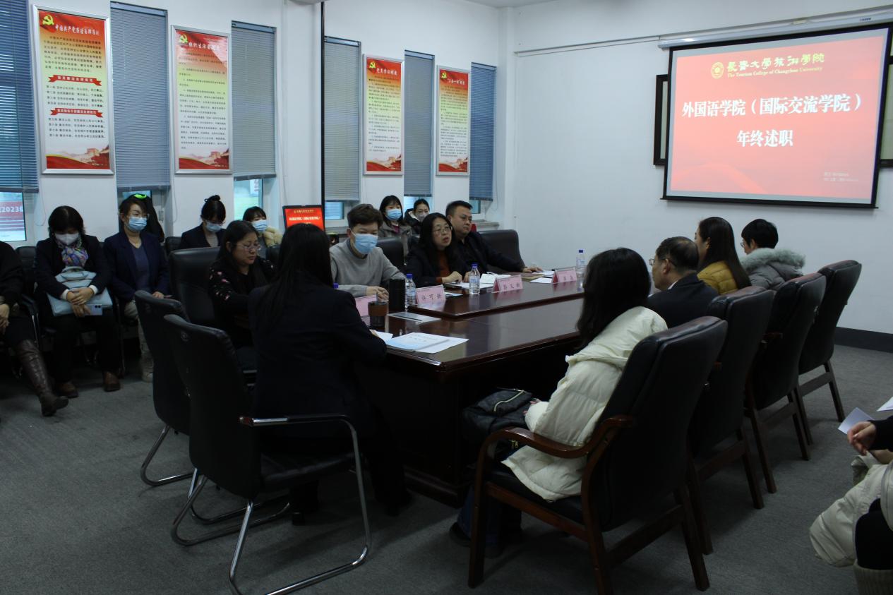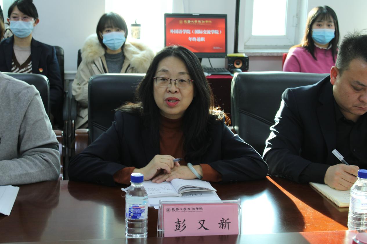 12月10日下午,外国语学院、国际交流学院在201会议室完成了2023年教职工年终述职考评会。院长彭又新、党总支书记蒋森、副院长许可新、副院长王丹、国际交流处副处长李春蓉,各专业带头人和全体教师参会。会议由彭又新主持。