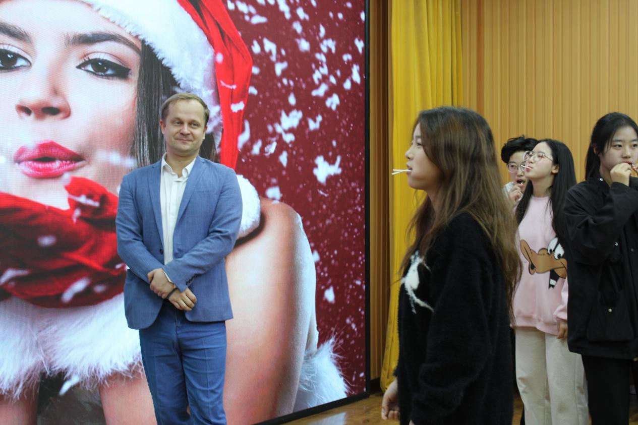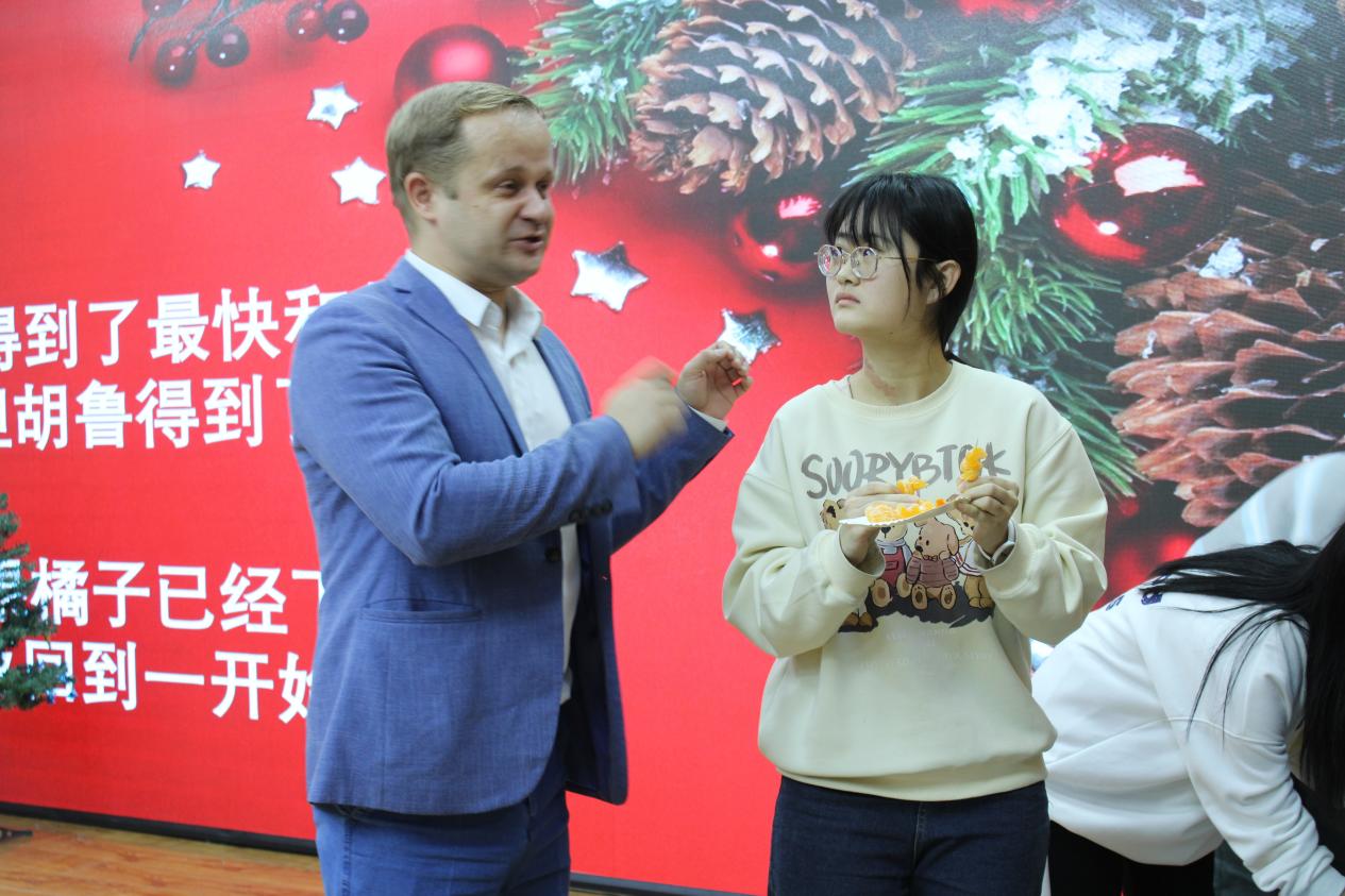 晚会开始,由外籍教师鲁斯兰首先致辞,他表达了对参加晚会老师和同学们的美好祝愿。晚会由俄语专业三年级李可欣和荆家露同学联袂主持,两位主持人声情并茂,获得了大家的热烈掌声。随后由同学们表演节目,展示才艺。主要节目有舞蹈,俄语歌曲,俄语配音短剧等,其中,还穿插了听歌识曲和看图猜成语等互动游戏,师生们积极参与、认真答题,气氛热烈。