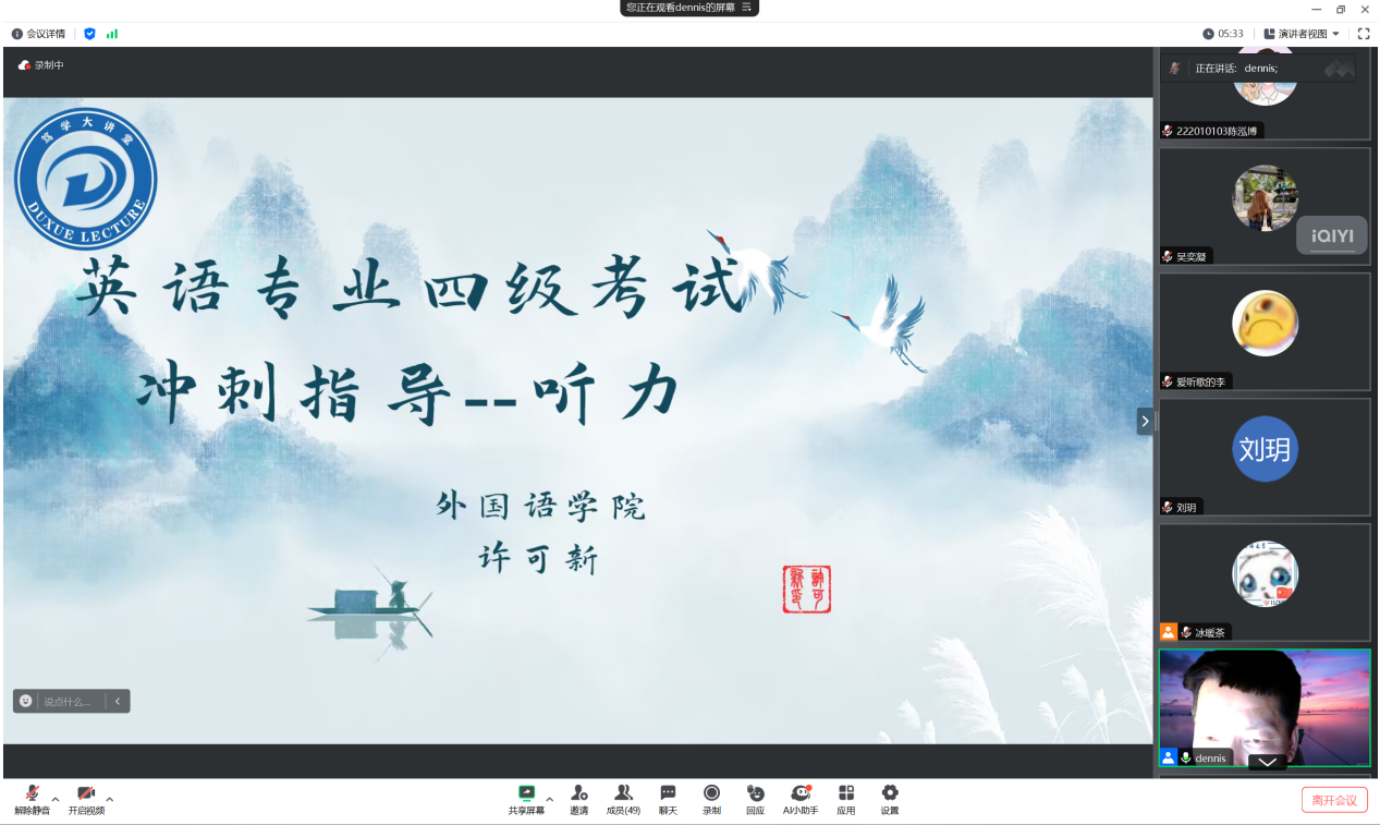 在距离英语专业四级考试还有1个月时间的黄金备考期,为帮助正在备考的在校生提高成功率,外国语学院于5月16日晚上8点线上开展了“笃学大讲堂”系列讲座第二讲--英语专业四级考试冲刺辅导。副院长许可新和李磊老师担任主讲,围绕听力、语法、词汇三个板块展,2021级、2022级英语专业60名同学参加。