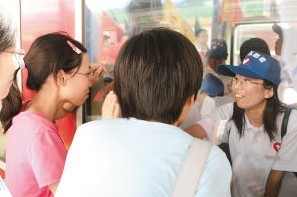 7月20日,北京火车站,一位西部志愿者隔着车窗玻璃与同学告别。