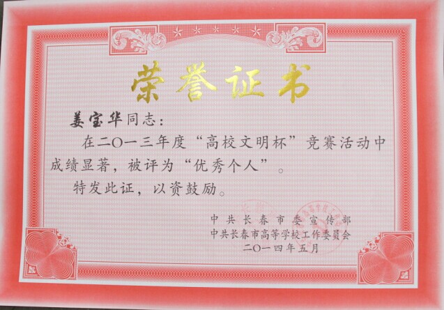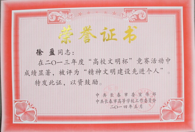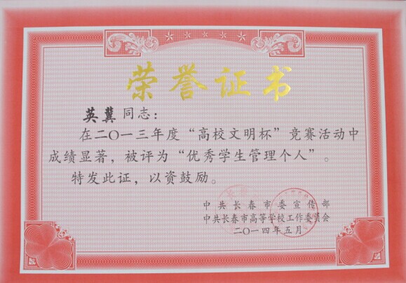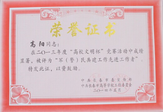 在长春市高校工委组织的2013年度“高校文明杯”竞赛活动中,我院斩获“先进基层单位”、“ 军(警)民共建工作先进单位”、“ 优秀学生管理集体”等4项集体荣誉和“优秀个人”、“精神文明建设先进个人”、“ 军(警)民共建先进工作者”等6项个人荣誉。具体如下:
