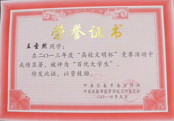 艺术学院建筑设计114103班学生王圣然获“百优大学生”