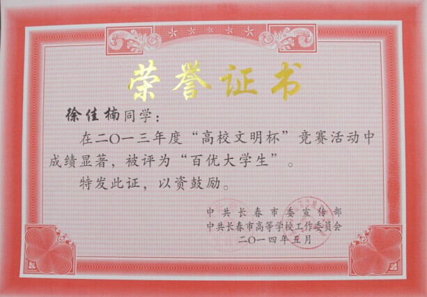 经济管理学院金融113701班学生徐佳楠获“百优大学生”