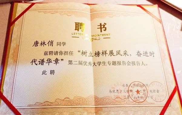 唐林俏在学习上踏实认真,不仅掌握各项专业知识和相关基础知识,还具备很强的社会实践能力。入学以来,各科成绩均分都在92分以上,始终名列前茅。2017年9月,荣获新生入学特等奖学金;2017-2018学年荣获国家奖学金;曾担任学校第二届优秀大学生专题报告会主讲学生,与全校新生分享自己的学习及生活经验;荣获“外研社杯”全国英语阅读大赛二等奖;作品《“优游君”旅行服务平台》荣获第八届全国大学生电子商务“创新、创意及创业”挑战赛吉林赛区三等奖。