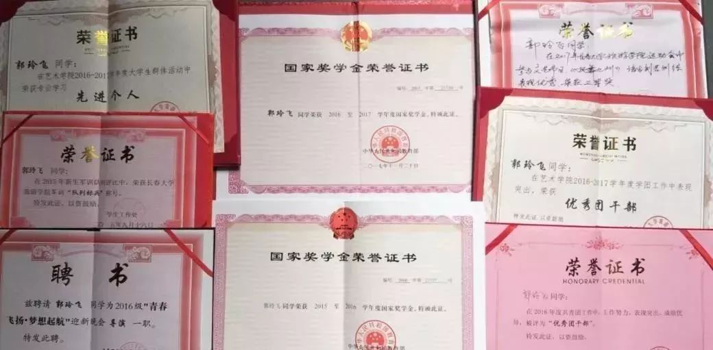 郭玲飞勤奋刻苦,认真钻研,注重与同学之间的交流学习。入校以来,她一直成绩优异,名列前茅,连续三年获得国家奖学金。在学好本专业课程的同时,郭玲飞还参加了教师资格证考试,顺利通过了笔试面试,增强了自身的文化基础和社会竞争力。此外,她充分利用图书馆资源,阅读其他学科书籍,畅游在知识的海洋中,不断充实自我。2017,荣获中国高校美术作品学年展优秀奖;2017年,荣获“大学生群体活动”专业学习先进个人奖;2018年,荣获“互联网+”校赛三等奖。