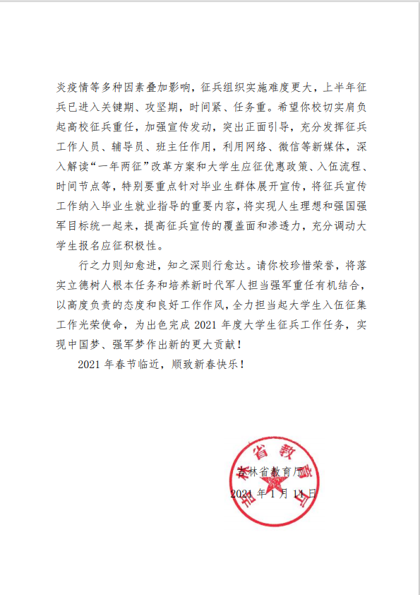 1月14日,吉林省教育厅对金沙官网2020年征兵工作发来表扬信。信中提到,金沙官网对征兵工作高度重视,学校领导靠前指挥、亲自调度,征兵工作部门加大动员力度,强化服务保障,做了大量卓有成效的工作,超额完成了年度大学生征集任务,为全省高校大学生征兵工作作出重要贡献!