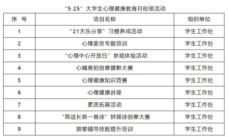 为落实立德树人根本任务,积极培育学生健全人格,丰富心理育人形式,营造和谐向上的心理健康氛围,充分调动学院开展心理健康教育的积极性和主动性,坚持以预防性和普及性教育为主,立足学校学科专业特色,聚焦提升学生心理健康素养,助力学生健康成长成才,学校将于5月—6月举办“5·25”大学生心理健康教育月系列活动,现将活动安排通知如下: