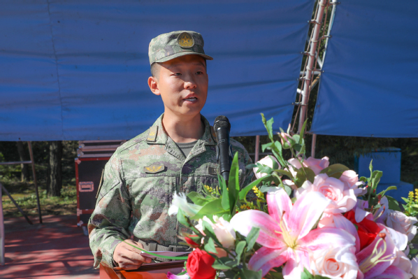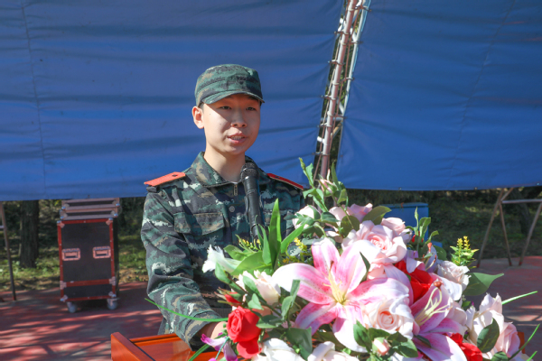 李秋昊同学代表全体新生向领导、教官、老师承诺,在军训中将服从命令、听从指挥,严格要求、刻苦训练,磨砺坚强意志、练就过硬本领,配合军训教官圆满完成本次军训任务。