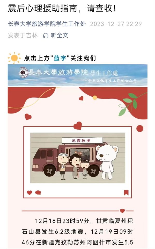 学生工作处大学生心理健康教育咨询中心发布震后心理援助指南