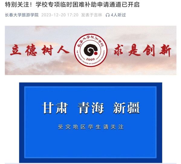 近日,甘肃临夏州积石山县及新疆克孜勒苏州阿图什市地震,给甘肃、青海、新疆部分地区造成一定人员伤亡和财产损失。学校始终秉承不让一名学生因家庭困难而失学的教育理念,第一时间开通临时困难补助申请通道。