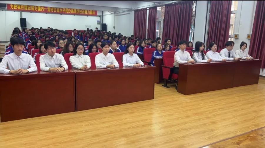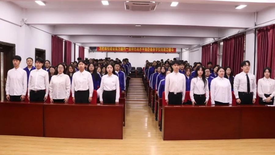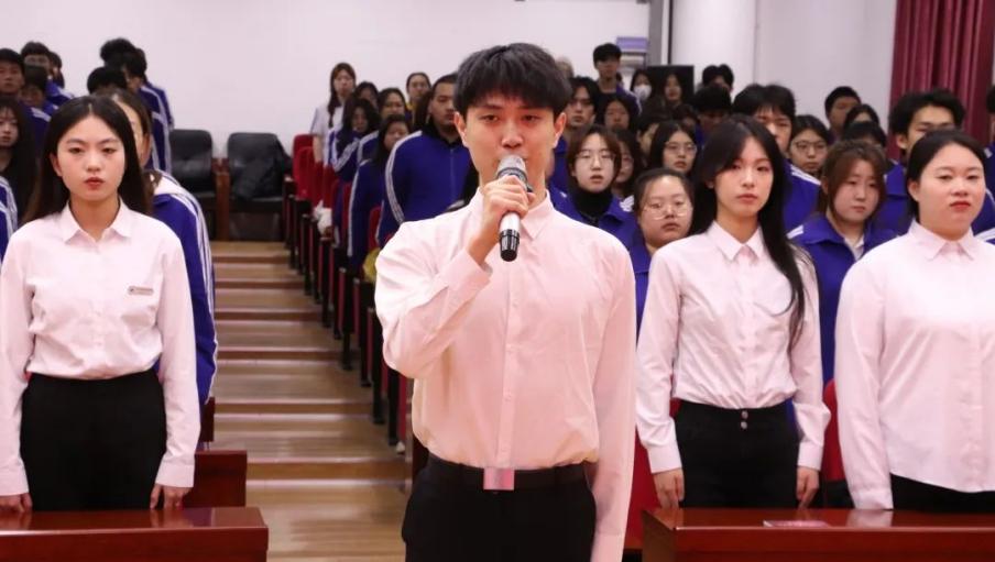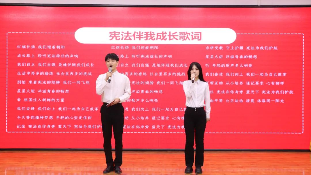 伴随主会场雄壮嘹亮的国歌和缓缓升起的五星红旗,全体同学起立,激情洋溢,齐唱国歌。随后,国旗护卫队队长徐亿杰带领会场学生跟随主会场共同宣读宪法部分条款,学习宪法知识,感受宪法力量。在思政委学生干部的带领下,全场齐唱《宪法伴我成长》,从优美的歌声中感受宪法温度、传递宪法精神。在观看第八届全国学生“学宪法讲宪法”活动全国总决赛演讲比赛优秀选手展演、领导宣讲宪法及领导讲话中感受宪法力量。