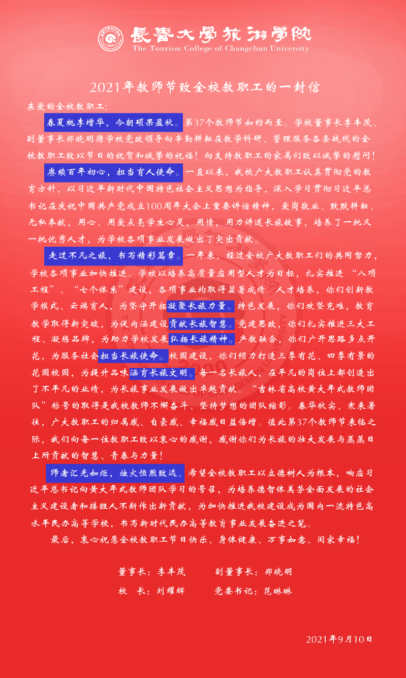 2021年教师节致全校教职工的一封信