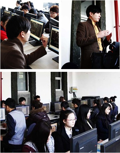 上午由云上设计工作室的设计师李明进行讲授。在艺术10机房,李老师先向同学们介绍了设计师日常的工作流程,以及与客户沟通时应注意的细节,列举出许多临场遇到的问题及解决办法的事例,同时阐述了自己对设计公司与装潢公司两行业的差异性观点。随后,李老师演示了部分设计案例,同时对案例进行了详细讲解。在此期间,李明老师对同学们关于案例提出的许多问题逐个进行了认真解答,如关于更改设计方案涉及的管道布置问题、设计费用问题、设计的感觉等等,现场交流气氛非常热烈。