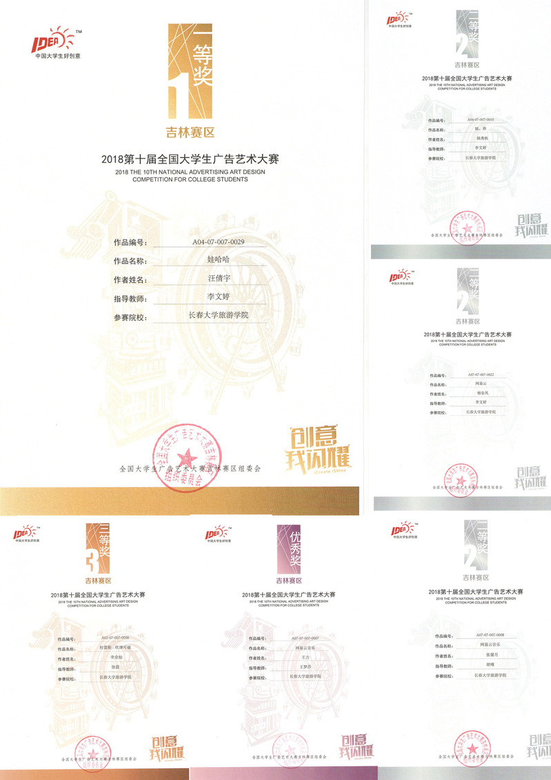 本次比赛收到了来自全国一千三百多所高校投递的数十万件参赛作品,金沙官网学生在视觉传达教研室徐震、李东娜、王梦莎、陈荣华、李文婷、胡唯几位老师的指导下,取得了优异的成绩。中汪倩宇同学《哇哈哈》获得一等奖;韩秀秋同学《娃养》,张馨月同学《网易云音乐》,杨金凤同学《网易云》荣获二等奖;李金灿同学《杜蕾斯·吹弹可破》,吕荣同学《与青春作伴》,于欣园同学《爱华仕》,刘江铠同学《世界是你的》,王盟同学《深意联想》李江雪同学《触电藤椒》,王梦同学《哇哈哈出门篇、哇哈哈上学篇》,王力同学《年轻潮色》,杨柳同学《引领潮流》,韩秀秋同学《源远流长》,杨怡贤同学《我很轻巧》,王力同学《网易云音乐》刘子坤同学《网易云音乐》获得了优秀奖。
