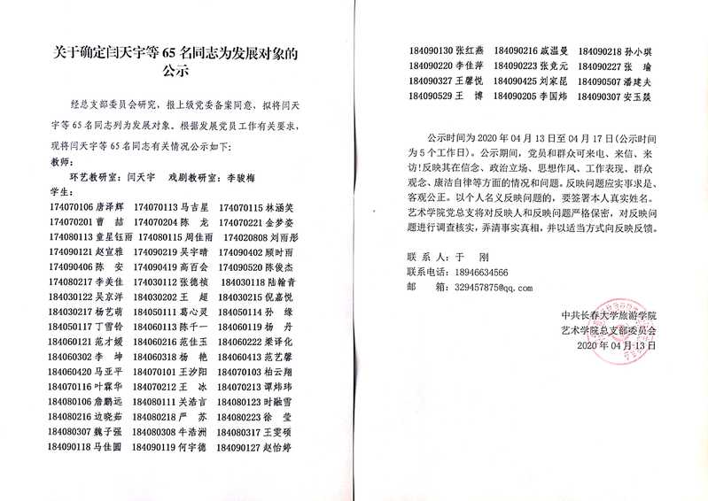关于确定闫天宇等65名同志为发展对象的公示