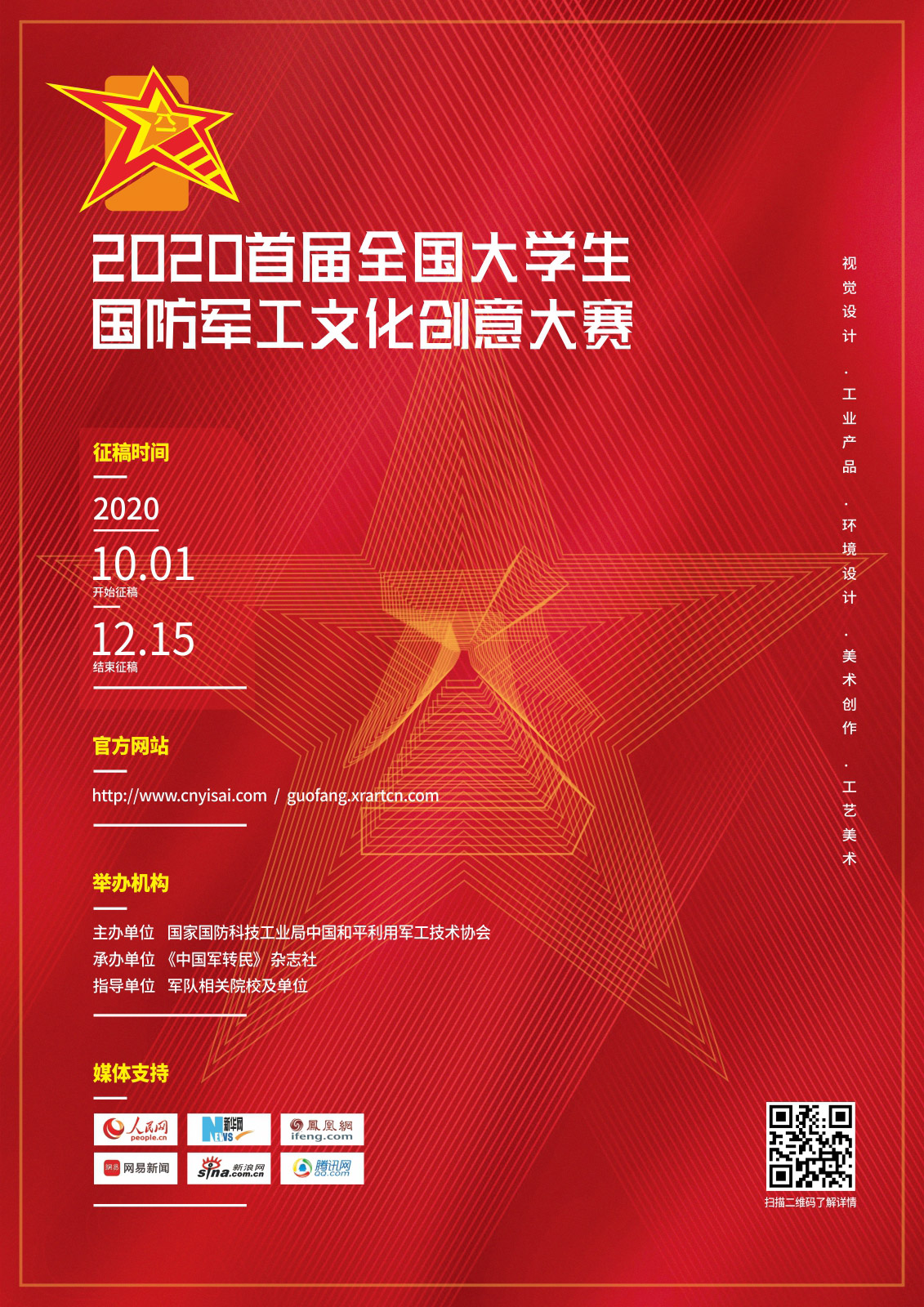 全国大学生国防军工文化创意大赛是由国家国防科技工业局中国和平利用军工技术协会主办,《中国军转民》杂志社、全国大学生国防军工文化创意大赛组委会承办的设计赛事,旨在为深入推动国防教育普及深入,配合教育部、中央军委国防动员部近日联合下发的2020年大学生征兵工作部署,提升大学生国防意识,掌握必要的国防和军工知识,特举办“首届全国大学生国防、军工知识竞赛暨全国大学生国防军工文化创意大赛。
