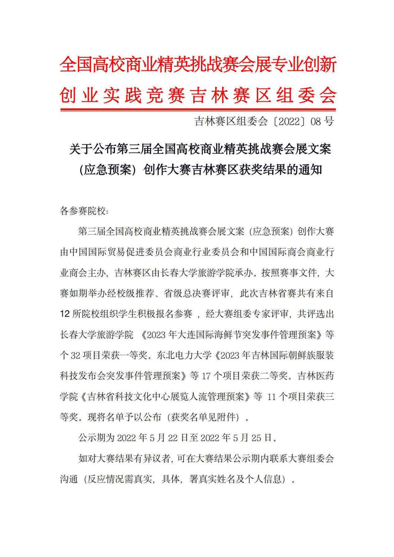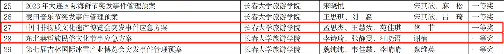 经过激烈角逐,最终由佟菲老师指导的孟思杰项目团队作品《中国非物质文化遗产博览会突发事件应急方案》、谢楠老师指导的李诗琦项目团队《东北赫哲族民俗文化节事应急方案》在众多高校作品中脱颖而出,荣获吉林赛区一等奖,并全部推荐全国总决赛评审。
