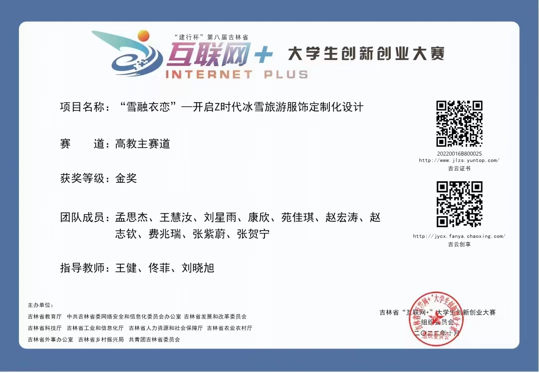 大学期间,在学业与科研的路上勤恳耕耘、努力探索,用勤奋和汗水收获了诸多成绩,连续三年综合成绩绩点与综测均为专业第一名。自入校以来,曾多次获得学校一等奖学金和三等奖学金;在全国高校商业精英挑战赛会展文案竞赛中,荣获国家级一等奖;曾获国家级展会设计师;大学生创新创业训练计划项目《吉林省冰雪旅游运动服饰创新设计及应用》已获得国家级立项;已申请《冰雪旅游》外观专利一项;大学生创新创业训练计划项目《康旅服饰》已结项;第二届·铸剑杯纪念人民军工创建九十周年文化创意大赛省级奖项二等奖两项、三等奖一项;第十三届“挑战杯”中国大学生创业计划竞赛省赛一等奖;大学生创新创业训练计划项目《VR数字满族服饰陈列馆》已获得省级立项;“建行杯”第八届吉林省“互联网+”大学生创新创业大赛荣获省级金奖一项、银奖一项;第四届“光华杯”吉林省电子商务案例分析大赛省赛二等奖、第九届吉林省服装设计效果图大赛优秀奖;第四届吉林省高校冰雪创意大赛省赛二等奖;“卡戳杯”吉林省会展创新创业竞赛省级二等奖。她能够时刻以“无惧风雨,迎难而上”的为人品格作为自己的行为准则。