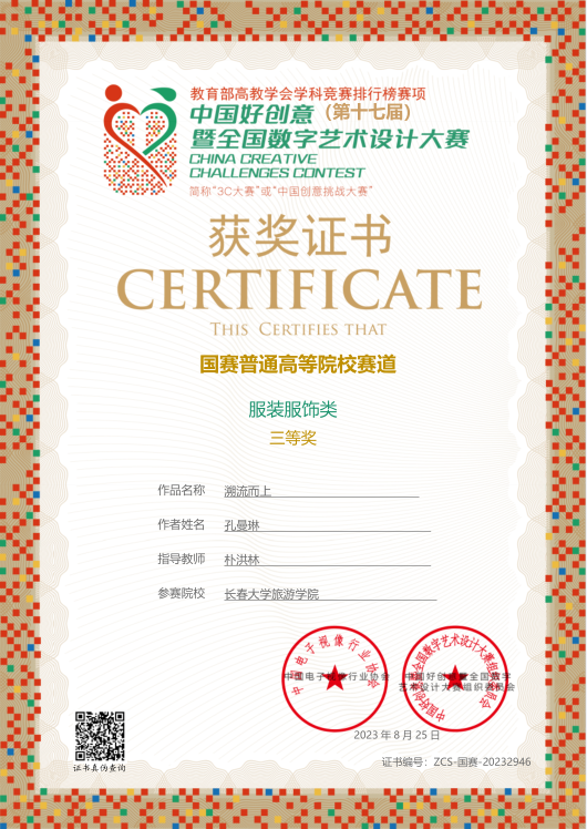 近日,艺术学院产品设计专业的孙雪冰同学荣获中国好创意设计大赛国赛二等奖,服装与服饰专业的孔曼琳同学荣获三等奖。中国好创意大赛是入选教育部中国高等教育学会发布的《全国普通高校学科竞赛排行榜》赛项,也是我国第一个以数字艺术设计、数字创意及数字媒体、数字技术创新领域各专业综合类规模大、跨学科、多专业、参与院校多、影响广泛的权威赛事。
