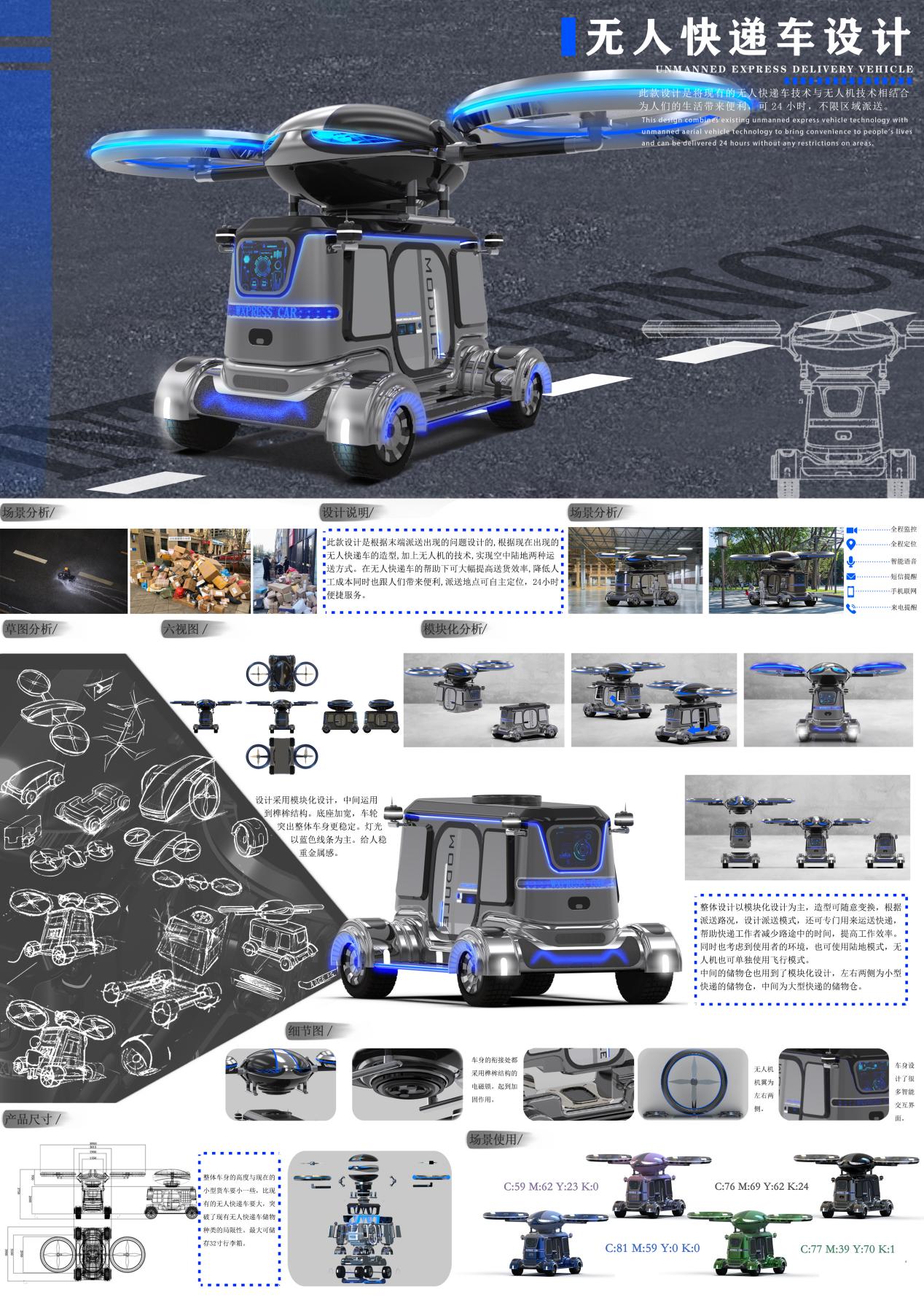 产品设计专业孙雪冰同学的《无人快递车》设计脱颖而出,无人快递运输车为分体模块化设计,造型简约,新颖时尚,能够满足城市快递运输业发展需求,荣获中国好创意设计大赛国赛二等奖,获此殊荣,既为广大同学树立了学习榜样,同时又激发了同学们的学习热情,这是产品设计专业“以赛促学”教学实践的又一成功案例,产品设计专业将一如既往的开展下去,鼓励同学积极参赛,为专业,为学院,为长旅争光添彩。