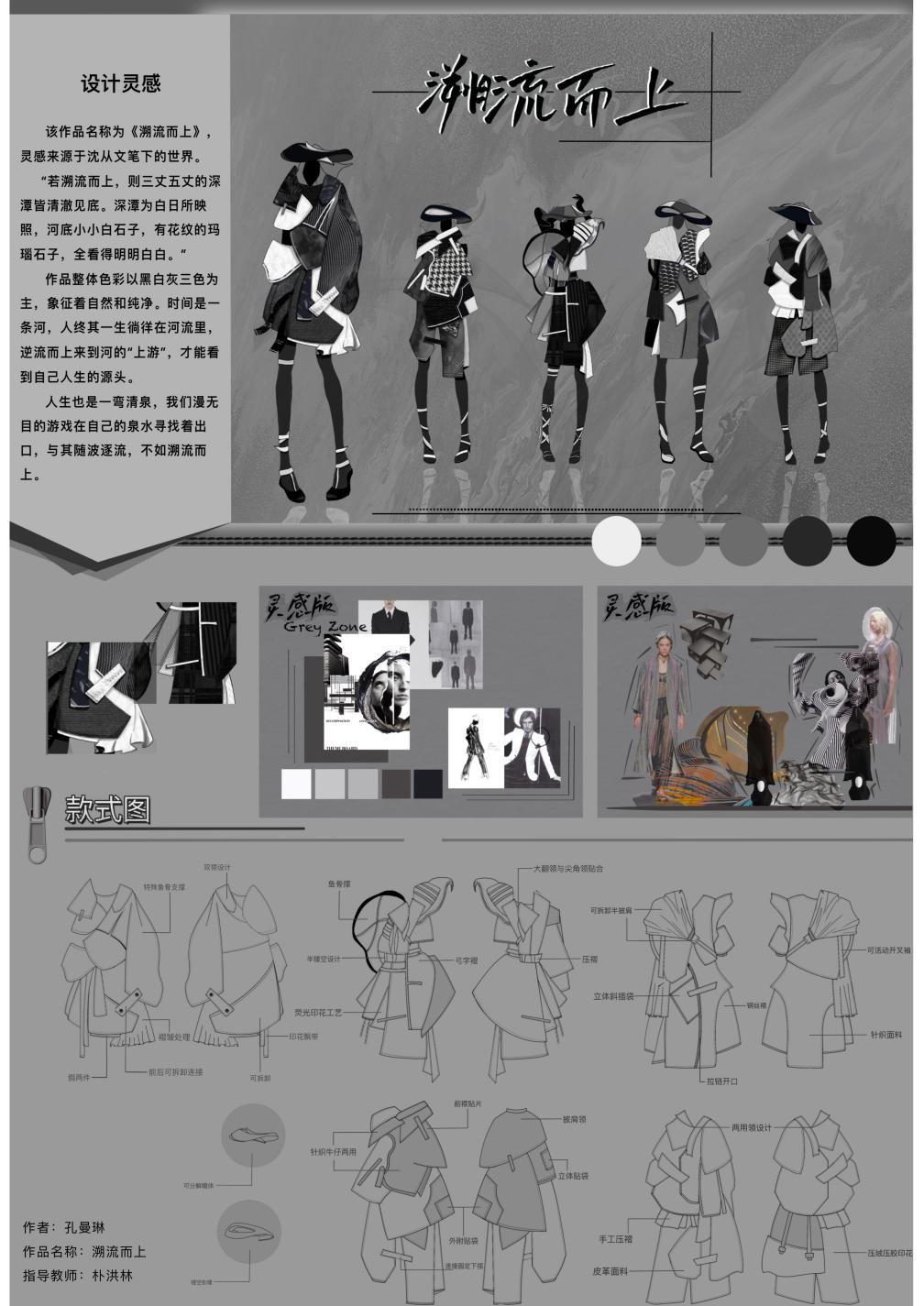服装与服饰专业的孔曼琳同学的《溯流而上》以其卓越的创意能力和突破性的设计理念吸引了评委们的眼球。别具心裁地将服装服饰的设计上展现出融合创新与传统的魅力。此作品以其独特的视角再加上在服装专业朴洪林老师的悉心指导下,作品将传统与现代相结合,运用先进的材料和工艺,以精湛的裁剪和精细的细节表达,打造出一系列兼具时尚感和特色的服装作品,充分展示了学院服装与服饰专业的风采,为其他学生树立榜样。