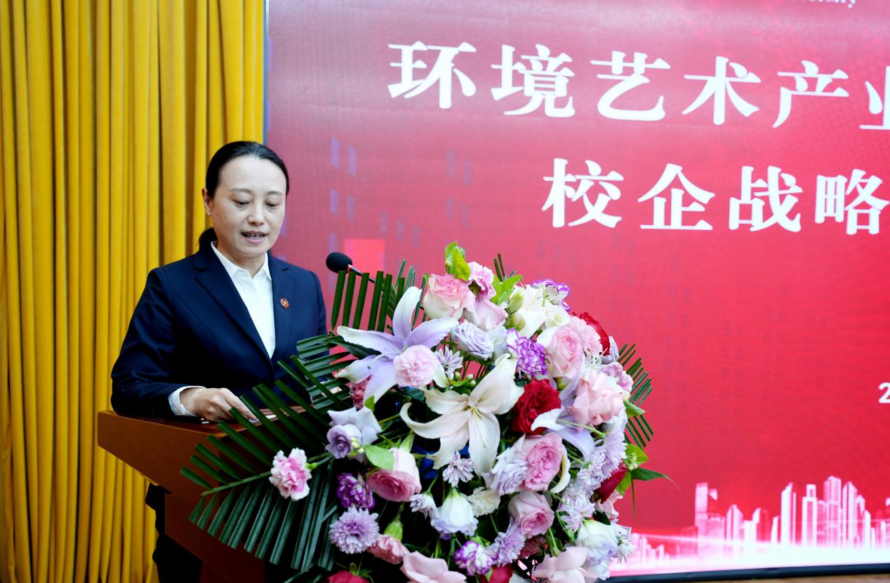 赵莹代表学校致辞。她首先对吉林省室内装饰协会及企业嘉宾的到来表示热烈欢迎,并介绍了学校近年来所取得的成就。她表示学校将与吉林省室内装饰协会、北京佳玥科技有限责任公司和各签约单位紧密合作,密切对接人才培养的专业链和企业发展的产业链,创新校企合作模式,从服务企业发展、服务区域经济发展的目标出发,规划好、设计好、实施好与各方的合作。环境艺术产业学院的成立,契合了建筑装饰行业应用型人才紧缺的市场需求,学校将以此次战略合作为契机,在专业建设质量、项目课程开发、实习就业、资源共享、教科研助力企业创新和成果转化等方面,积极推动协会、企业、学校各方深度融合发展,搭建建筑装饰领域高端平台,为地方区域经济发展提供人才支撑和智力支持。