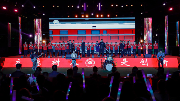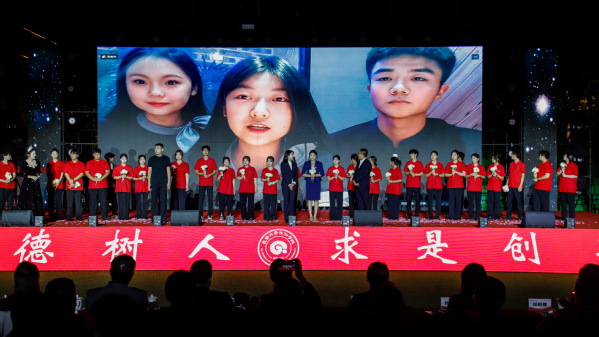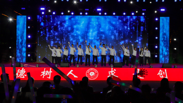 上合专项实训实验班同学带来的精彩合唱《鲜花》,充分展示了他们的实习、实践成效。随后,校友代表、俄罗斯交流生和在“东北亚长旅号”上提供专项服务的优秀学生代表也通过现场表演和视频连线的方式加入晚会,形成了场内外共同欢唱的青春交响。