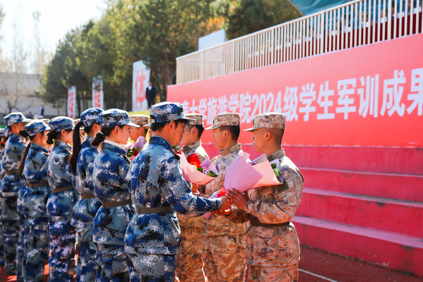 为表达对承训部队和教官的感激之情,刘耀辉代表学校为65370部队赠送锦旗。部队教官在军训期间,不辞辛劳,耐心指导,为同学们的成长付出了辛勤的汗水。他们的专业精神和敬业精神,赢得了师生们的一致赞誉。这面锦旗不仅承载着学校对部队官兵无私奉献精神的崇高敬意,更象征着军、校之间的深厚情谊和共同育人的坚定信念。各连队学生代表也为承训教官献上了鲜花,以表达他们对教官辛勤付出的感激之情。