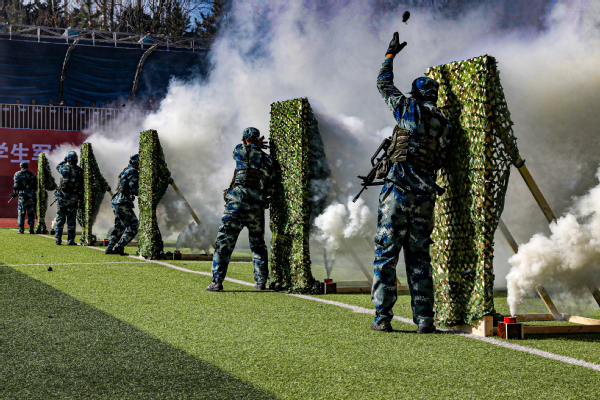 “按计划进行!”随着张海涛下达指令,军训成果汇报表演正式开始。同学们身着整齐的军装,迈着铿锵有力的步伐,充分展示军训期间的训练成果。他们队列整齐,步伐一致,口号嘹亮。从队列动作到军事技能,每一项都展现出他们严谨的态度和顽强拼搏的精神风貌。