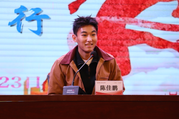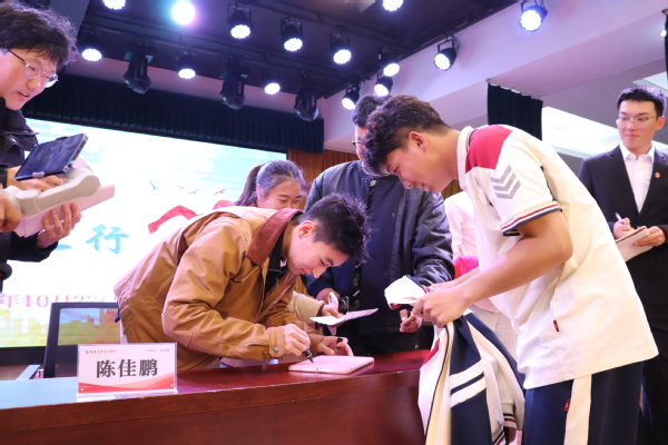 本次活动分为对话座谈、互动交流、签字合影三个环节。活动伊始,陈佳鹏与同学们分享自己的体育之路、拼搏之路、冠军之路。面对紧张情绪,他用顽强的意志和扎实的训练排除万难;面对迷茫低谷,他说热爱可抵万难,厚积方可薄发;面对伤病压力,他不忘初心、团结队友、心怀祖国,用信念和毅力扛起为国争光的责任。